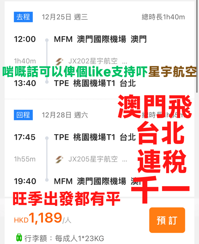 抵呀!連稅千一!星宇航空澳門飛台北!包23kg寄艙行李!明年4月18日前出發!澳門飛台北來回連稅$1,177起 – 星宇航空