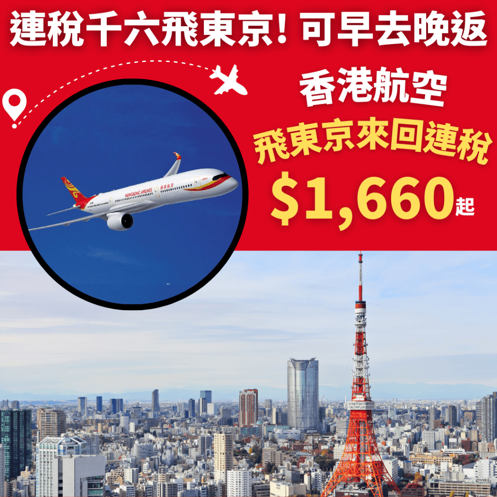 連稅千六飛東京!可早去晚返!7月10日前出發!香港飛東京來回連稅只需$1,660起 – 香港航空 (優惠至5月31日)