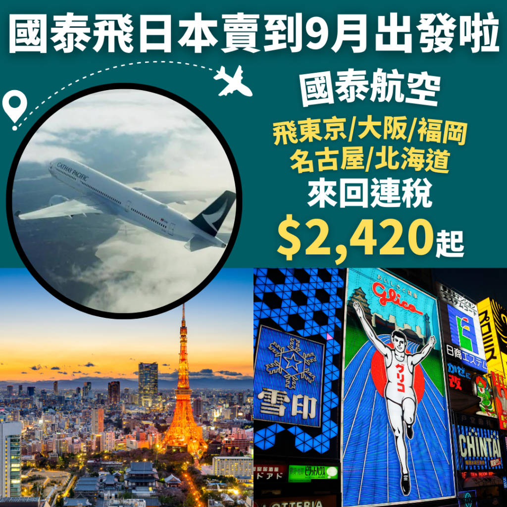 國泰日本優惠!賣到9月出發啦!連稅2千4起!香港飛東京/大阪/福岡/名古屋/札幌來回連稅$2,420起 – 國泰航空 (優惠至5月12日)