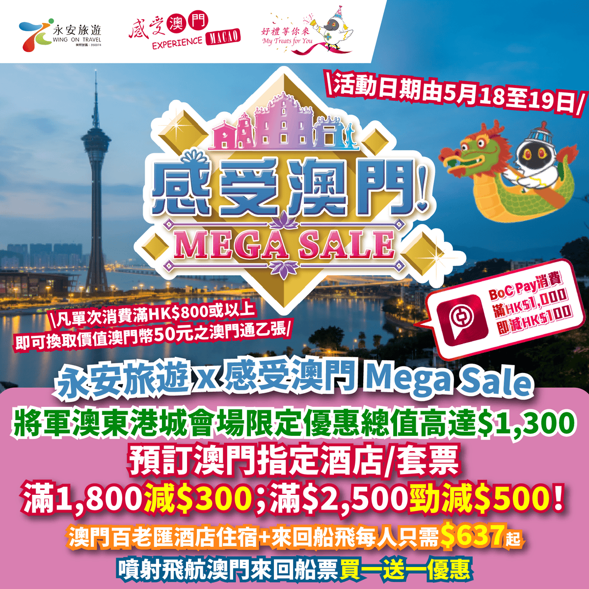 【永安旅遊 x 感受澳門 Mega Sale 】超抵澳門套票!<會場限定>優惠總值高達$1,300!澳門酒店/套票滿1,800減$300;滿$2,500勁減$500!澳門百老匯酒店+來回船飛每人$637起!仲有來回船票買一送一優惠!