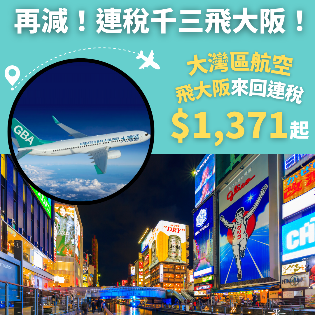 再減!連稅千三飛大阪!6月5日前出發!香港飛大阪來回連稅只需$1,371起 – 大灣區航空 (優惠至5月10日)
