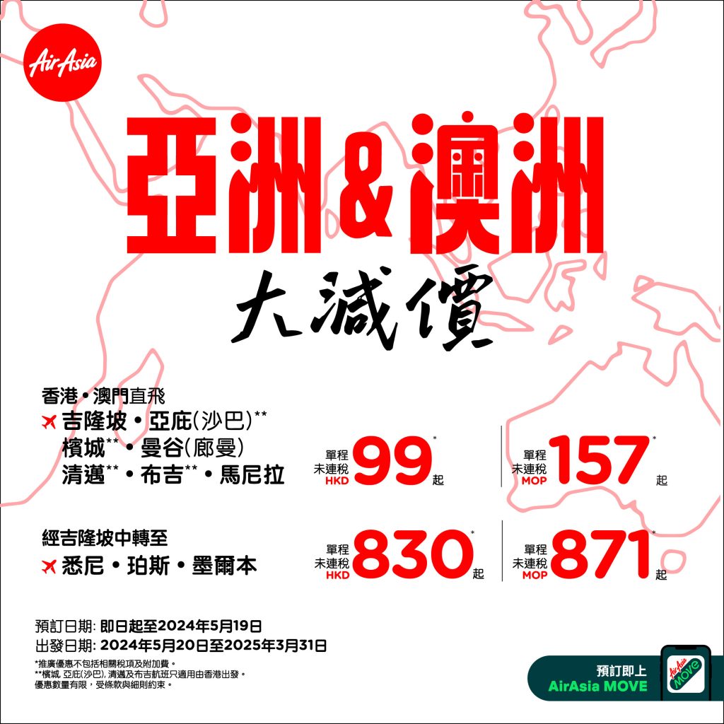 AirAsia大減價!HKD99起飛吉隆坡/HKD108起飛亞庇(沙巴)/HKD151起飛布吉!所有票價都包免費7kg手提行李!寄艙行李不限件數之餘買40kg仲有高達6折!明年3月31日前出發!飛澳洲都有優惠 (優惠至5月19日)