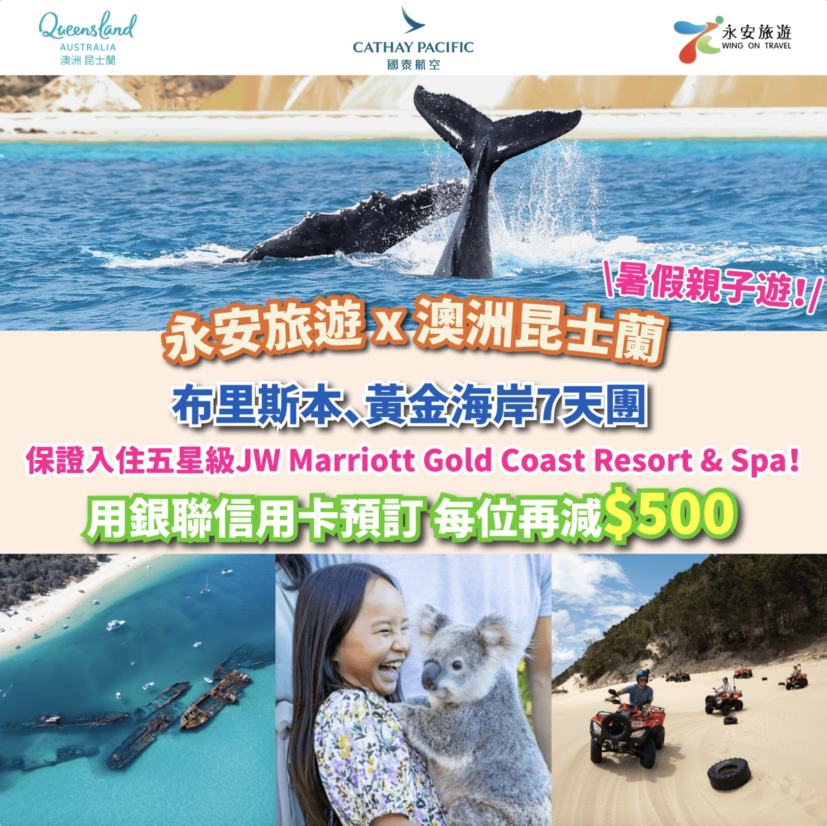 永安旅遊 x 澳洲昆士蘭推出咗暑假布里斯本、黃金海岸7天親子遊旅行團!憑銀聯信用卡或銀聯二維碼網上報名用推廣碼【UPL500】每位再減$500!