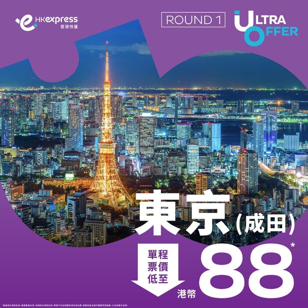 第一擊!東京限時優惠!明年3月22日前出發!暑假旺季都有!香港飛東京成田單程只需$88起 – HK Express (優惠至5月9日9:59am)