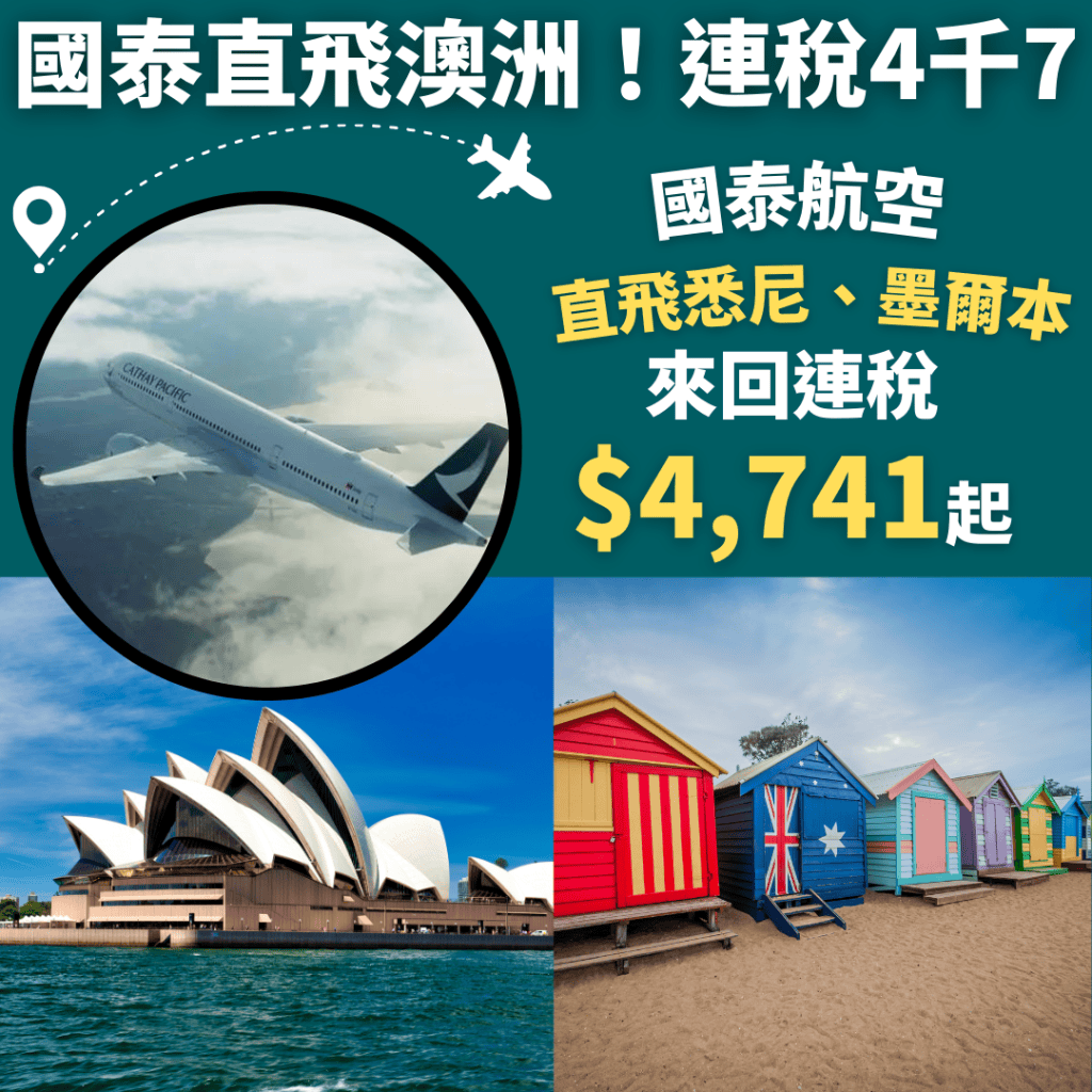 國泰跟減!直飛澳洲連稅4千7起!11月30日前出發!香港直飛悉尼、墨爾本來回連稅$4,741起 – 國泰航空 (優惠至5月13日)