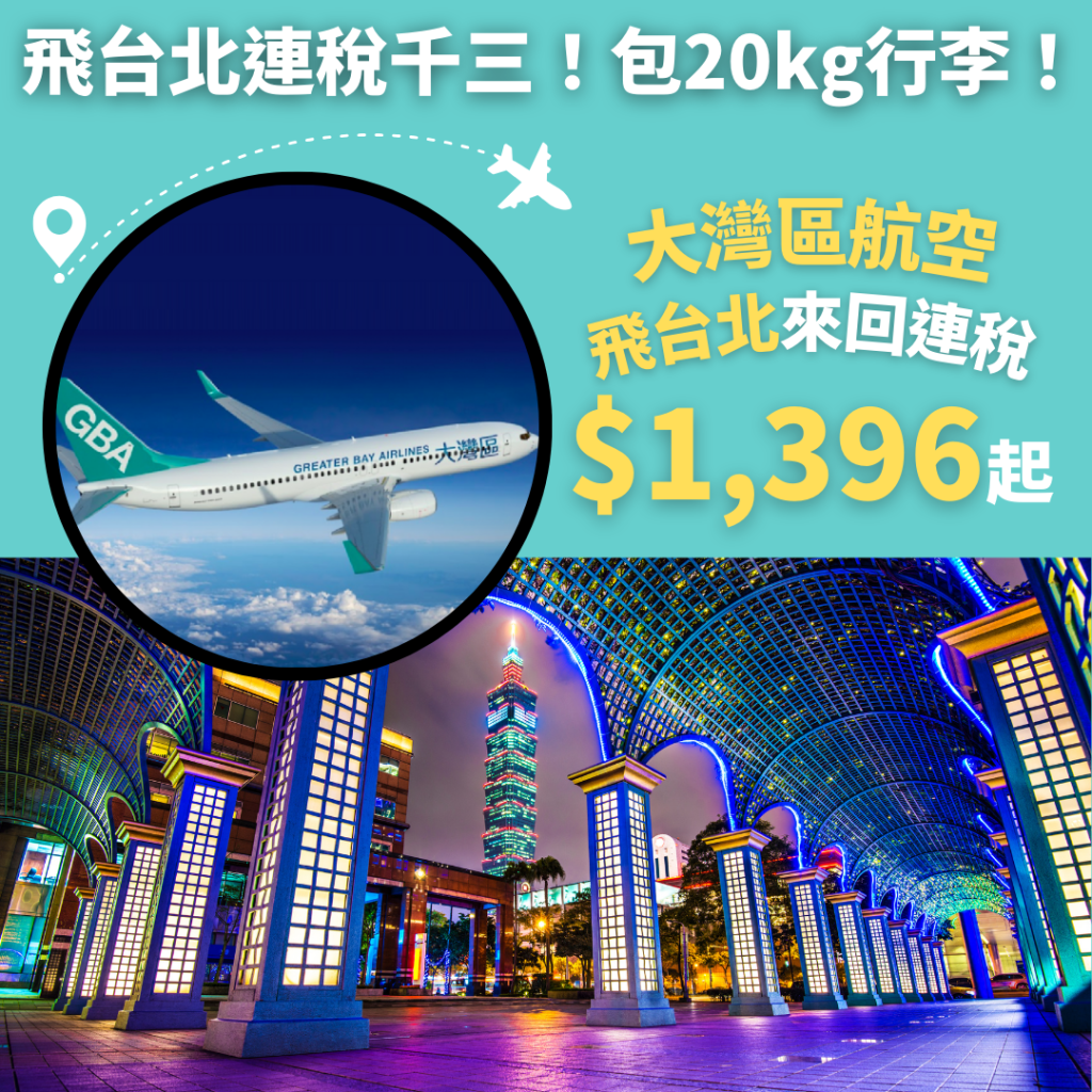 限時4小時台北優惠!連稅千三!包20kg寄艙行李!7月13日前出發!香港飛台北來回連稅只需$1,396起 – 大灣區航空 (優惠延長至5月15日12noon)