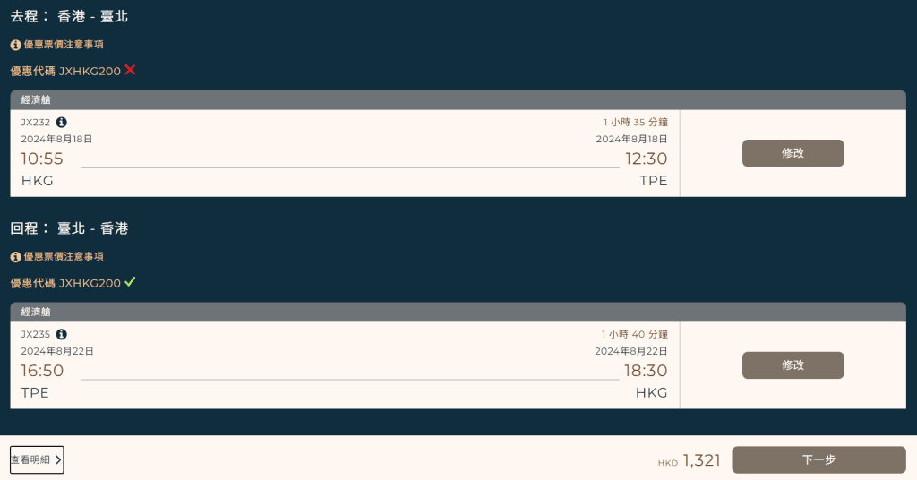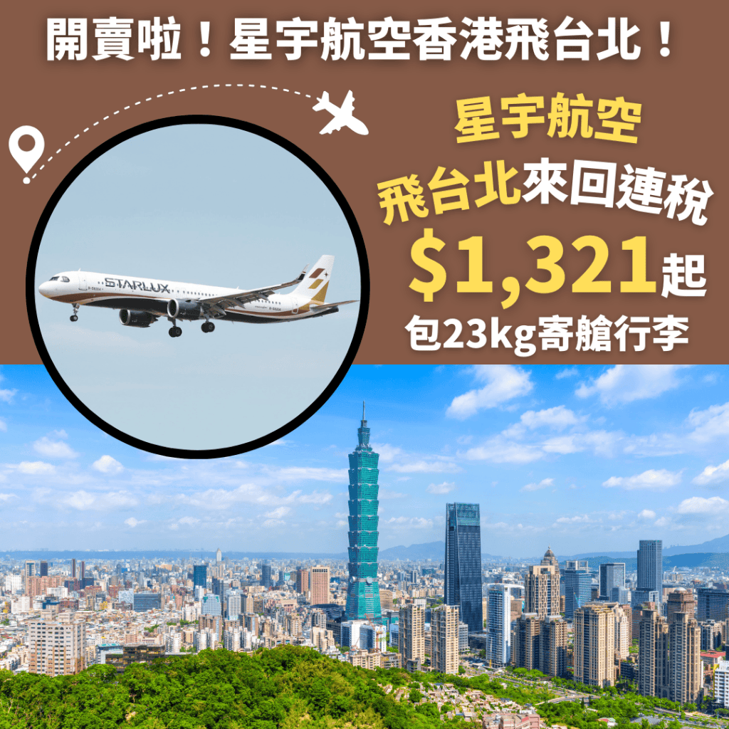 香港飛台北來回連稅只需$1,321起!包23kg寄艙行李!