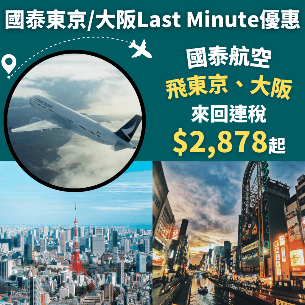 國泰飛東京/大阪Last Minute優惠!連稅二千八起!6月27日前出發!香港飛東京/大阪來回連稅$2,878起 – 國泰航空 (優惠至6月27日)