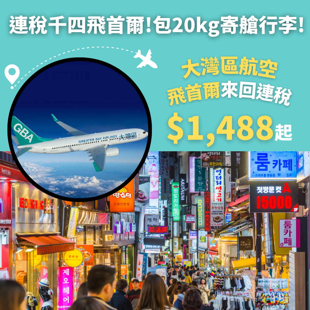 限時7小時!連稅千四飛首爾!包20kg寄艙行李!香港飛首爾二人同行來回連稅每人$1,488起 – 大灣區航空 (優惠至5月20日6pm)