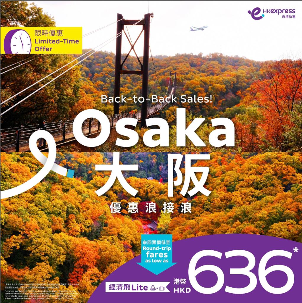 $268飛大阪!明年3月14日前出發!香港飛大阪單程只需$268起 – HK Express (優惠至6月30日)