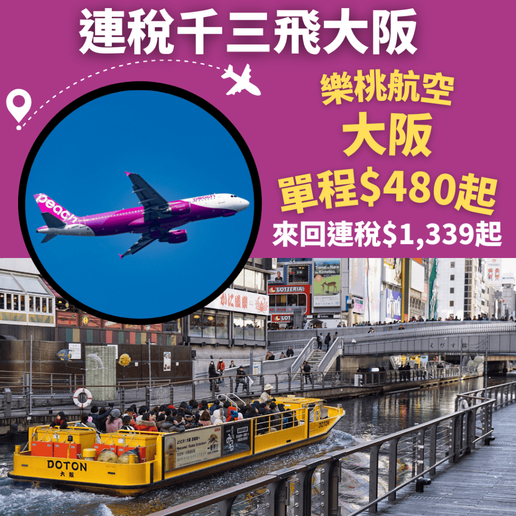 連稅千三飛大阪!樂桃夏季優惠!10月26日前出發!香港飛大阪單程$500起,大阪飛香港單程$440起 (不收燃油附加費) – 樂桃航空 (優惠至7月4日)