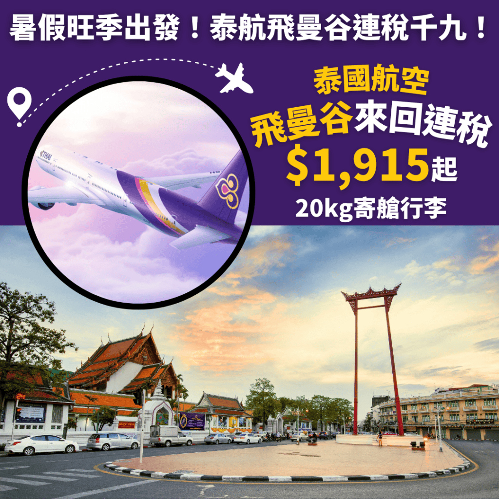 香港飛曼谷來回連稅只需$1,915起,包咗20kg行李
