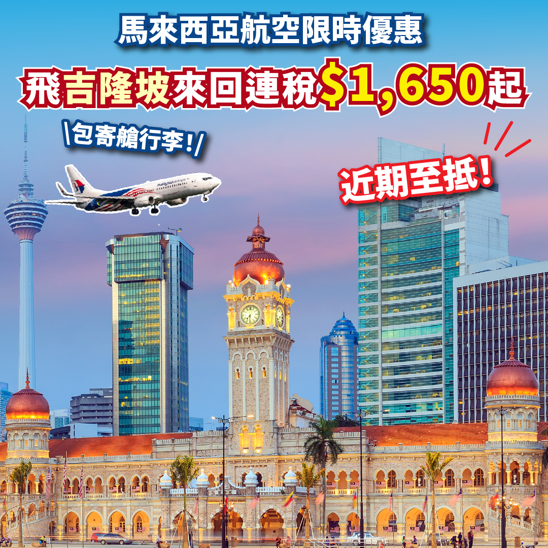 近期至抵!連稅千六飛吉隆坡!馬航限時優惠!暑假旺季都有平!明年6月30日前出發!吉隆坡來回連稅$1,650起,包寄艙行李! – 馬來西亞航空 (優惠至7月23日)