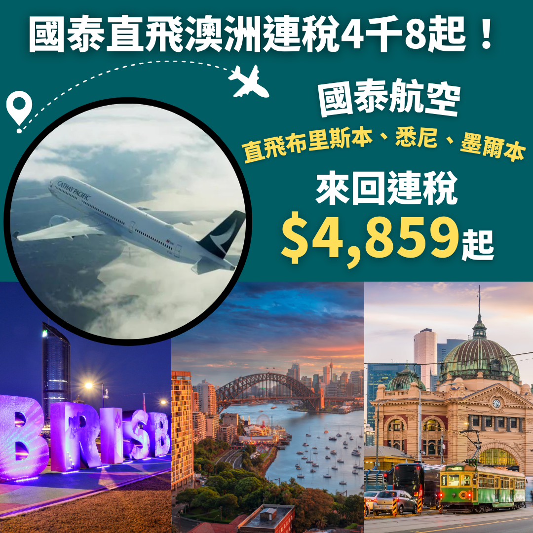 連稅4千8起!國泰直飛澳洲香港直飛墨爾本來回連稅只需$4,859起、悉尼$4,998起 – 國泰航空 (優惠至7月21日)