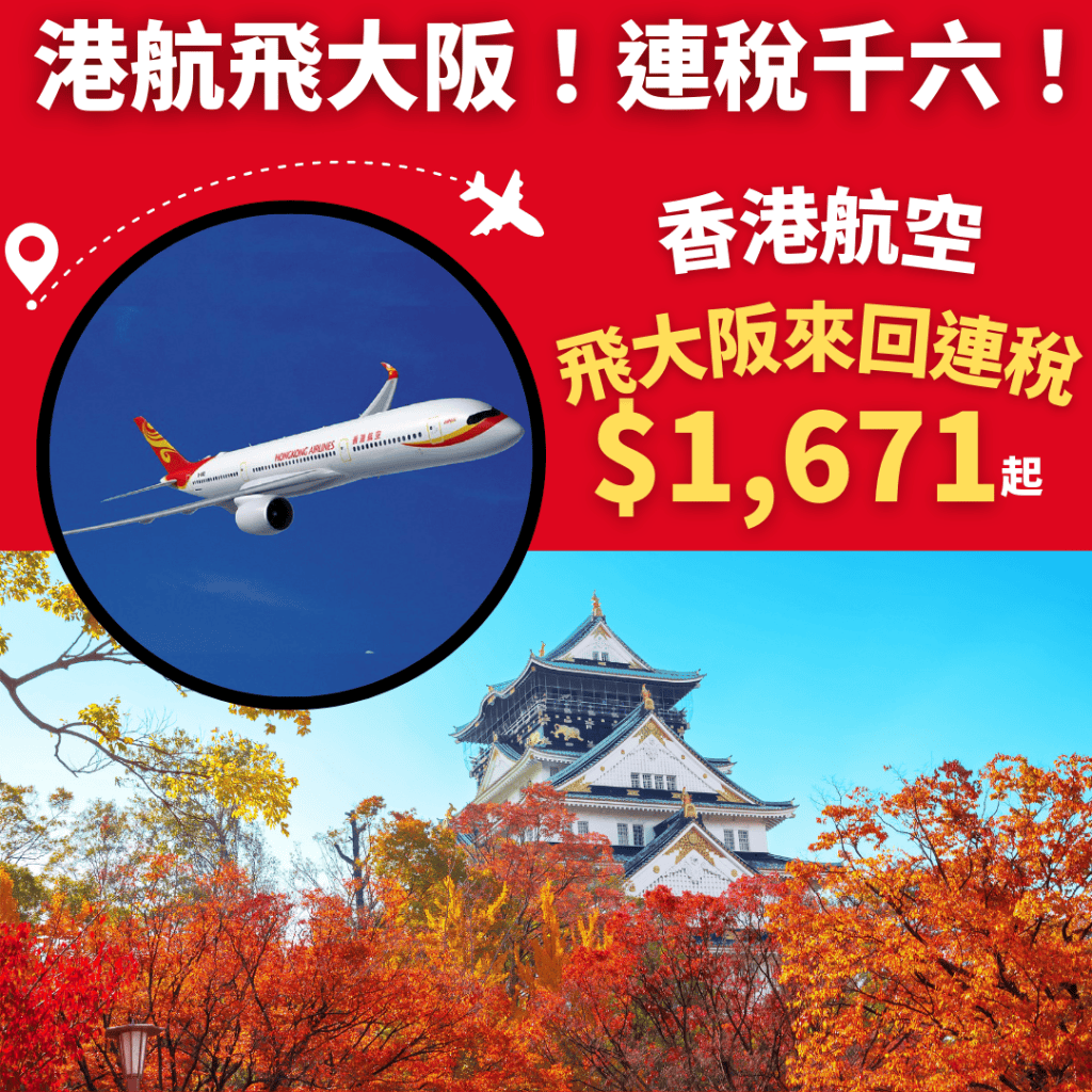 港航飛大阪優惠!連稅千六!10月至明年1月出發!香港飛大阪來回連稅只需$1,671起 – 香港航空