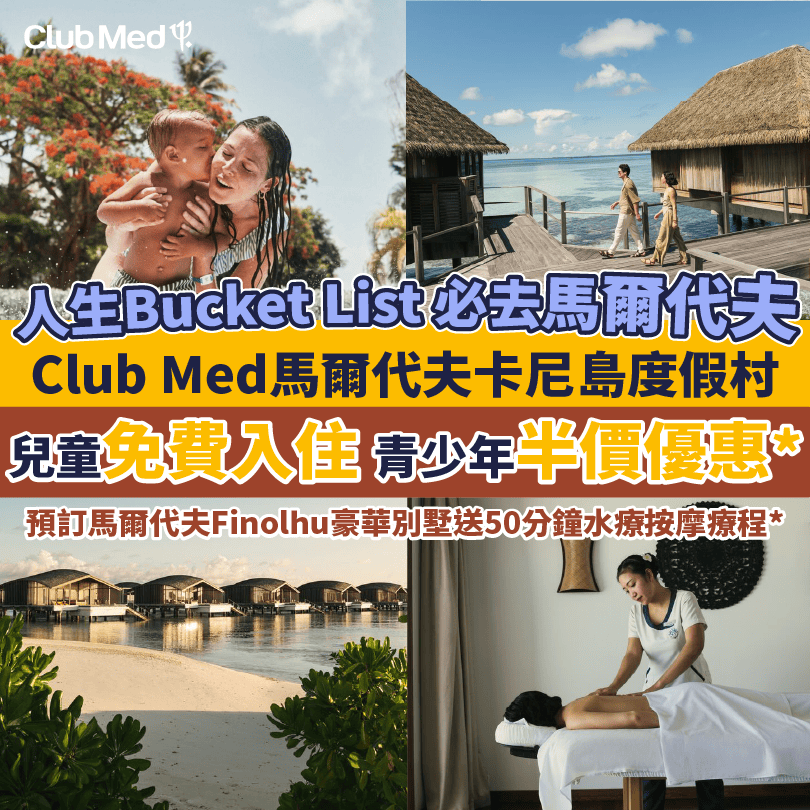 【Club Med馬爾代夫限時優惠】人生Bucket List必去馬爾代夫!馬爾代夫卡尼島度假村兒童免費入住!青少年半價優惠*!預訂馬爾代夫Finolhu豪華別墅送50分鐘水療按摩療程*!住宿+飲食+水陸活動一價全包!