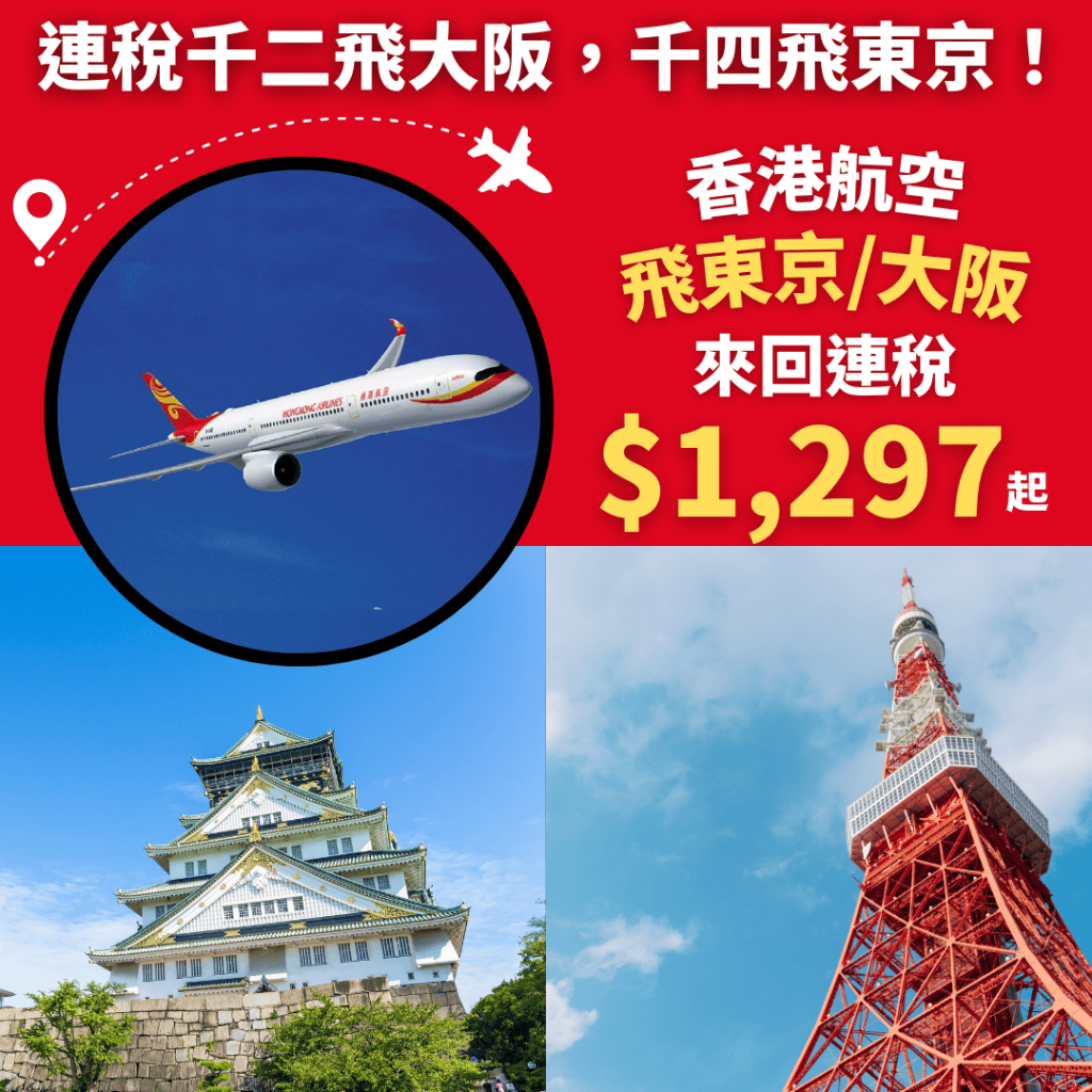 連稅千二飛大阪,千四飛東京!9月25日前出發!香港飛大阪來回連稅只需$1,297起、東京$1,461起 – 香港航空 (優惠至7月31日)