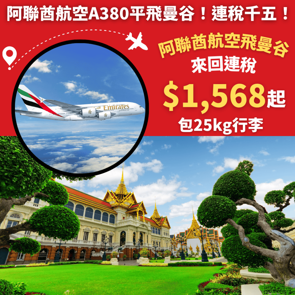 阿聯酋航空A380平飛曼谷!連稅千五!包25kg行李!明年1月22日前出發!香港飛曼谷來回連稅只需$1,568起 – 阿聯酋航空 (優惠至8月10日)