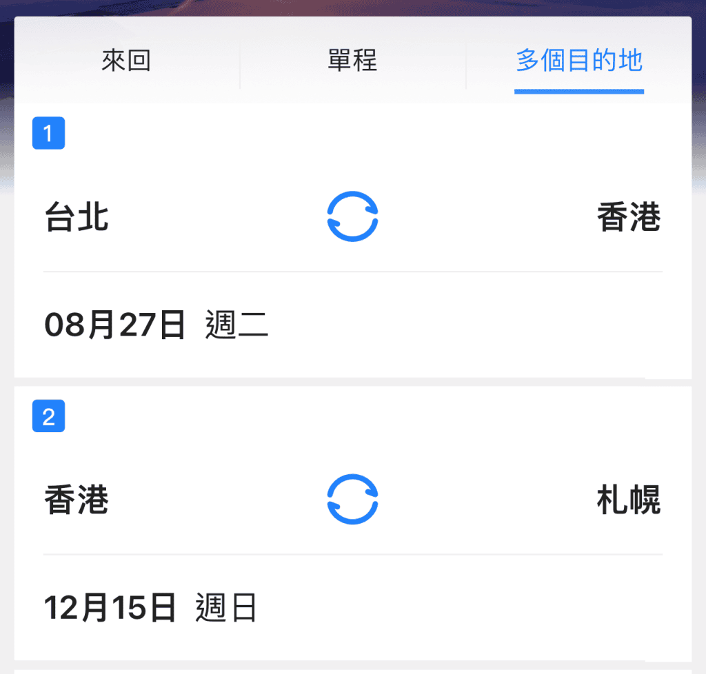 大家可以上永安旅遊用“多個目的地”功能訂購,第一程”台北飛香港”,第二程”香港飛札幌”