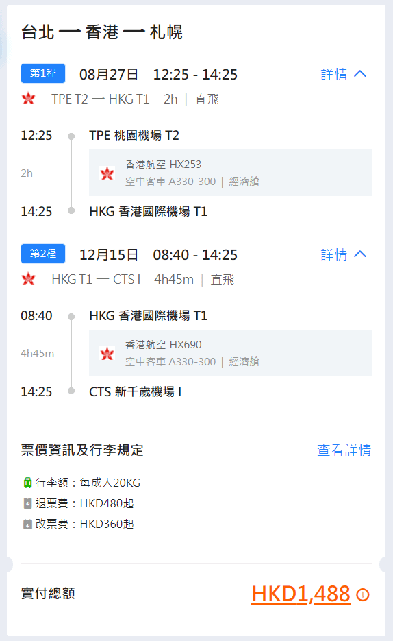 (必需留意:第一段”台北飛香港”係必需要飛,否則第二段”香港飛札幌”會立即失效)