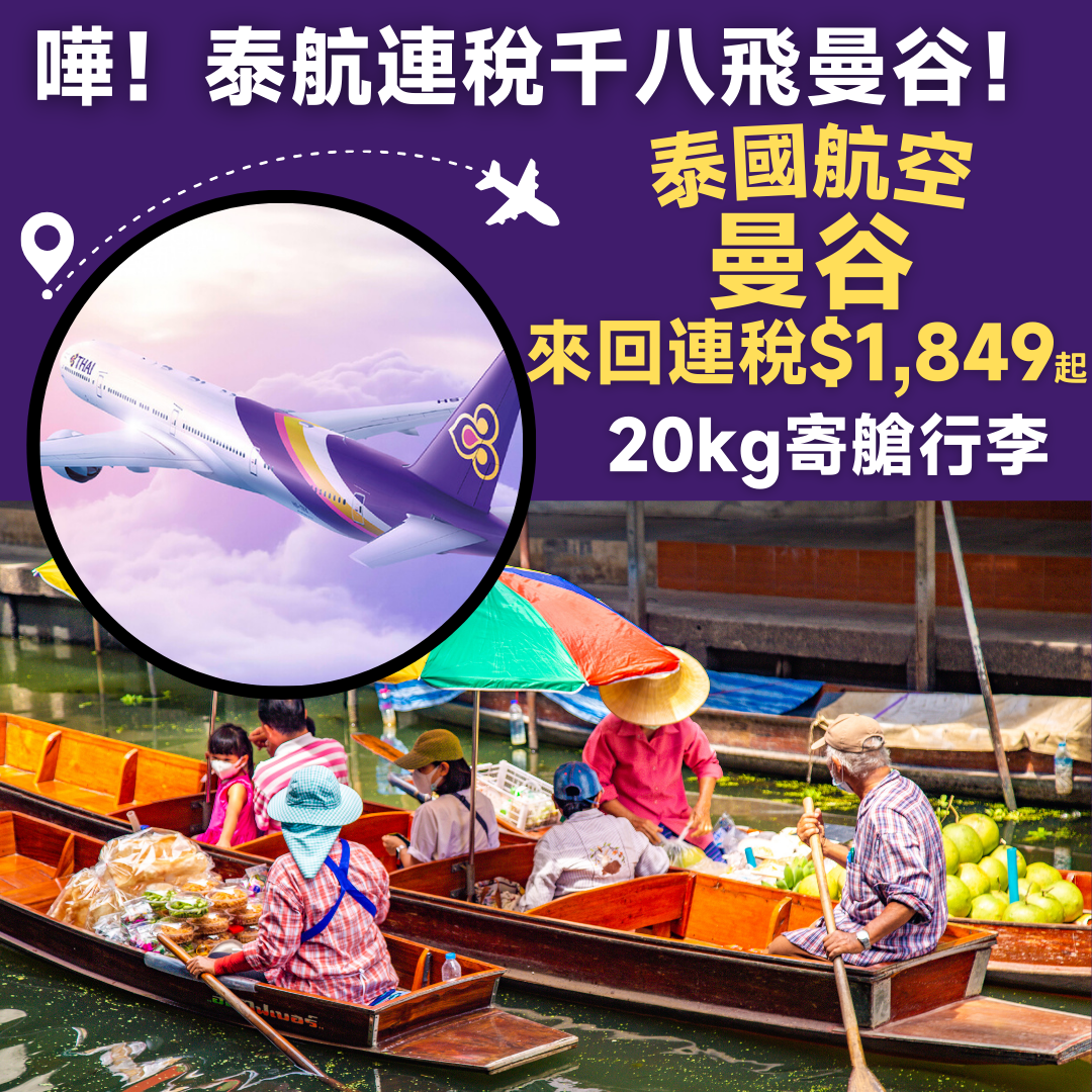 泰航連稅千八飛曼谷!12月13日前出發!香港飛曼谷來回連稅只需$1,891起 – 泰國航空 (優惠至8月31日)
