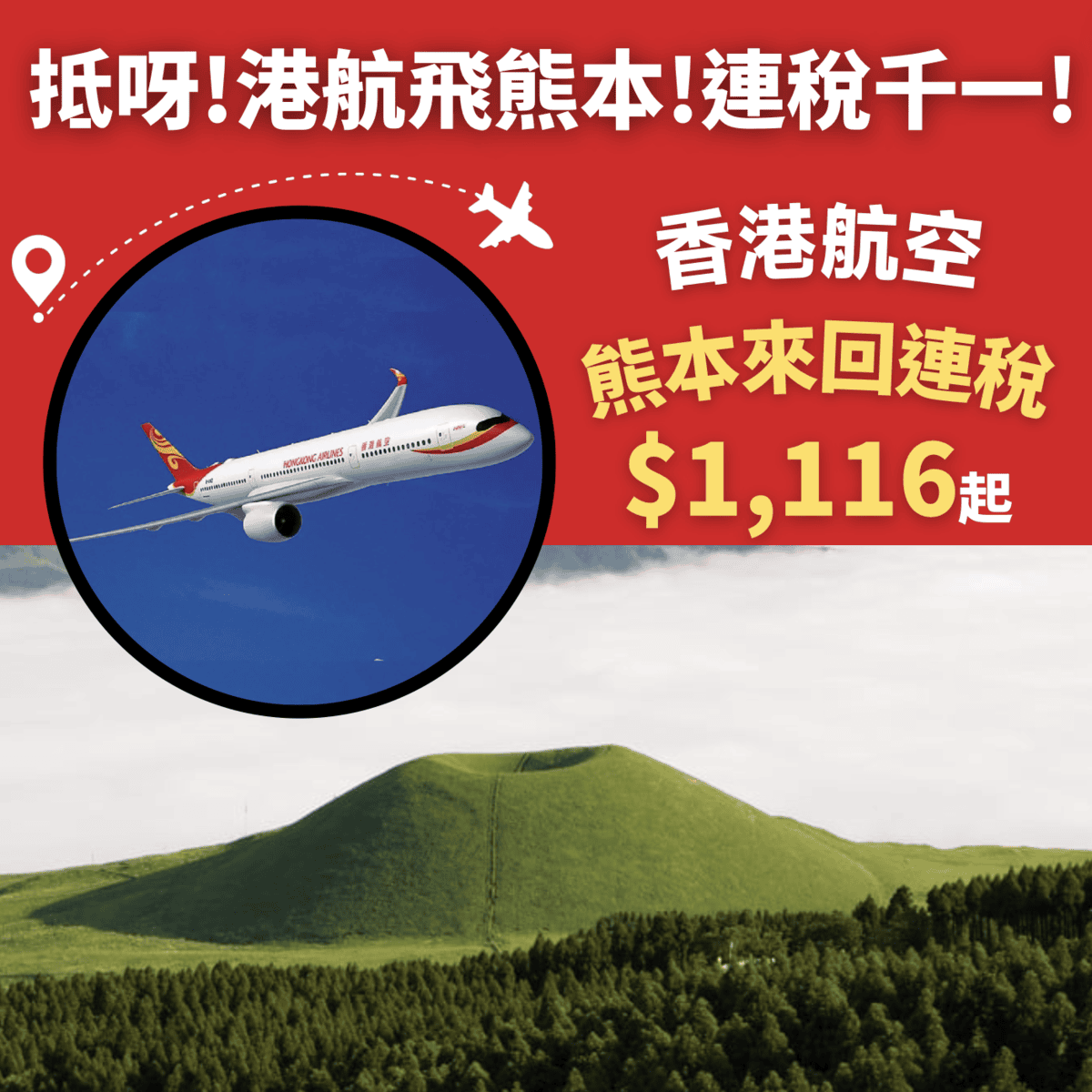 9折後,9-10月出發!香港飛熊本來回連稅只需$1,116起