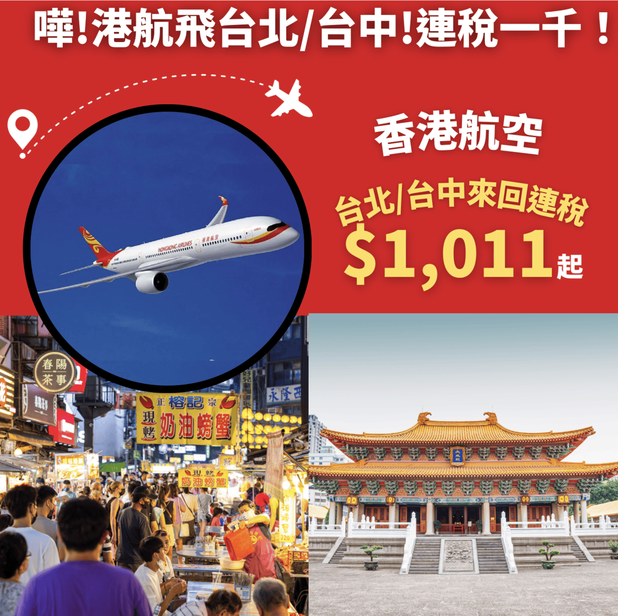港航飛台北/台中!連稅一千!香港飛台北、台中來回連稅只需$1,011起 – 香港航空