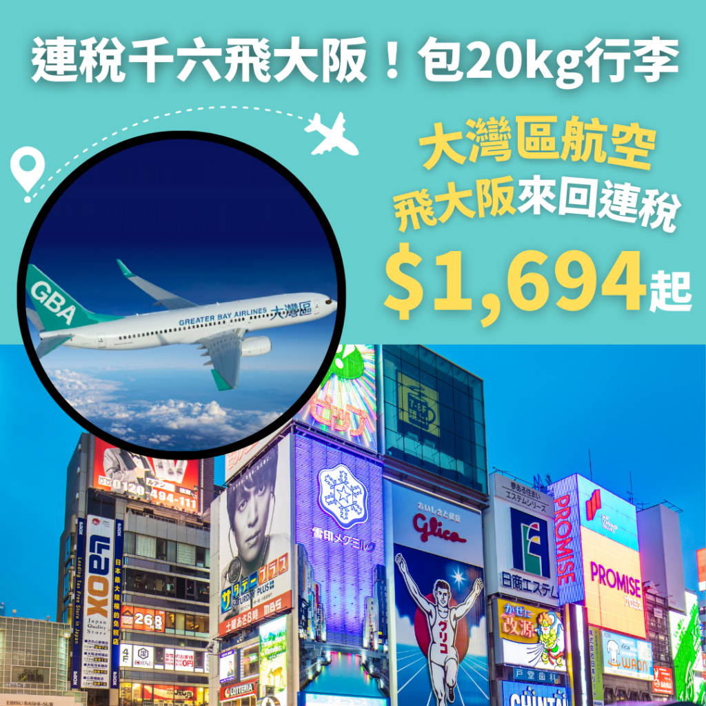 抵呀!連稅千六飛大阪!包20kg寄艙行李!9月26日前出發!香港飛大阪來回連稅$1,694起 – 大灣區航空 (優惠至9月15日)