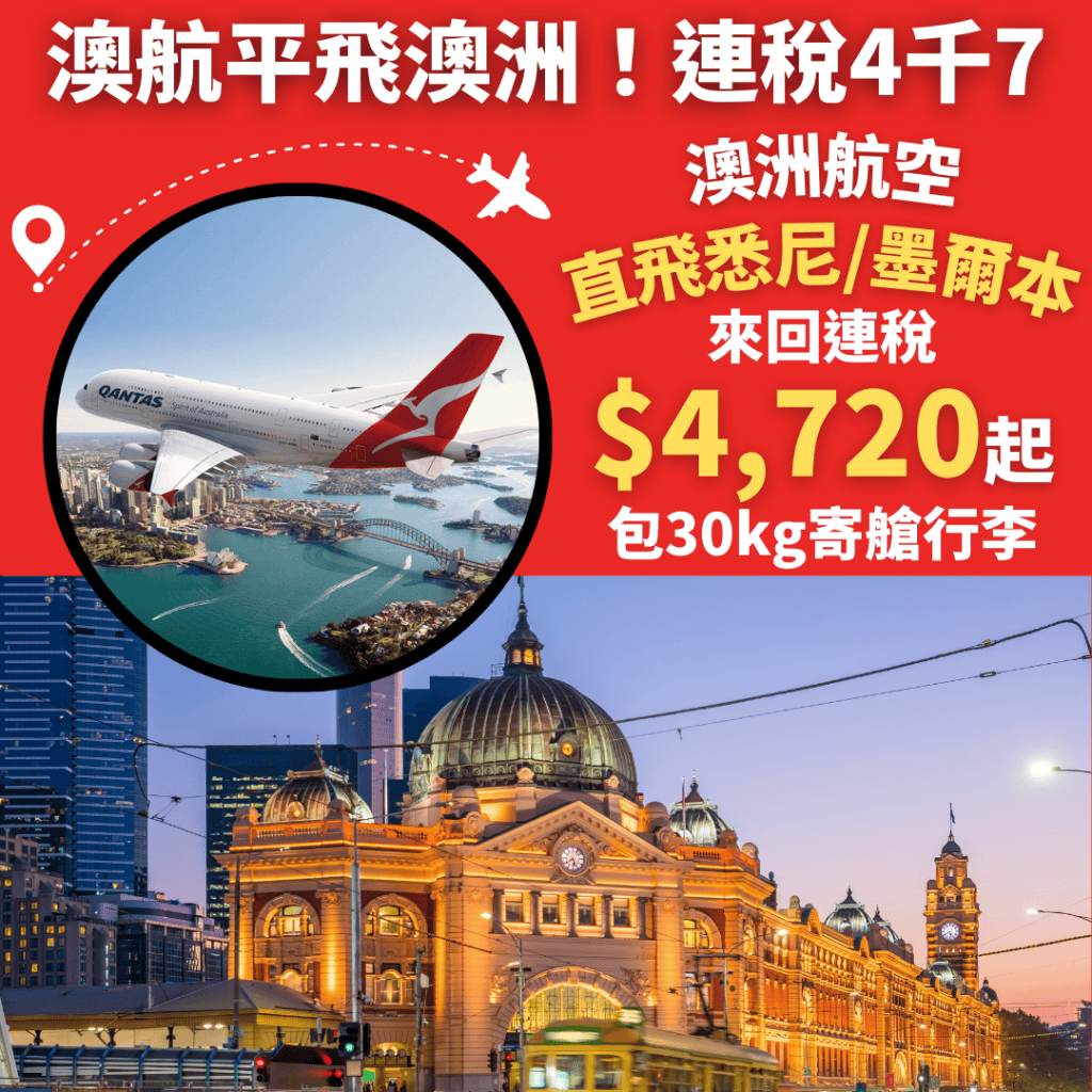 連稅4千7起!澳航直飛澳洲!明年6月27日前出發!香港直飛悉尼、墨爾本來回連稅只需$4,720起 – 澳洲航空 (優惠至9月15日)