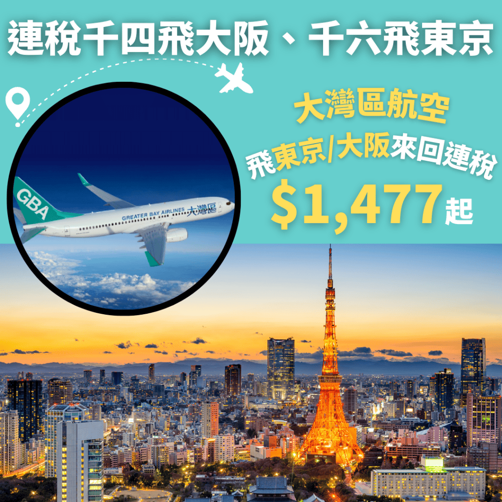 連稅千四飛大阪、千六飛東京!包20kg行李連稅千七起!11月30日前出發!香港飛大阪來回連稅只需$1,477起、東京$1,673起 – 大灣區航空 (優惠至9月23日)