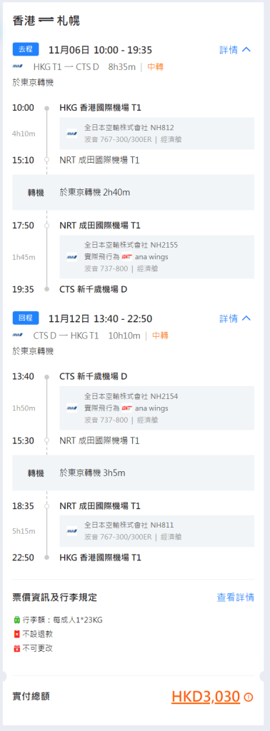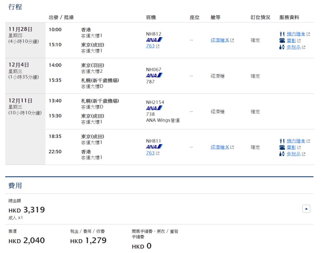 以28/11香港飛東京成田,4/12東京羽田飛札幌,11/12札幌飛香港(經東京成田),來回連稅$3,319