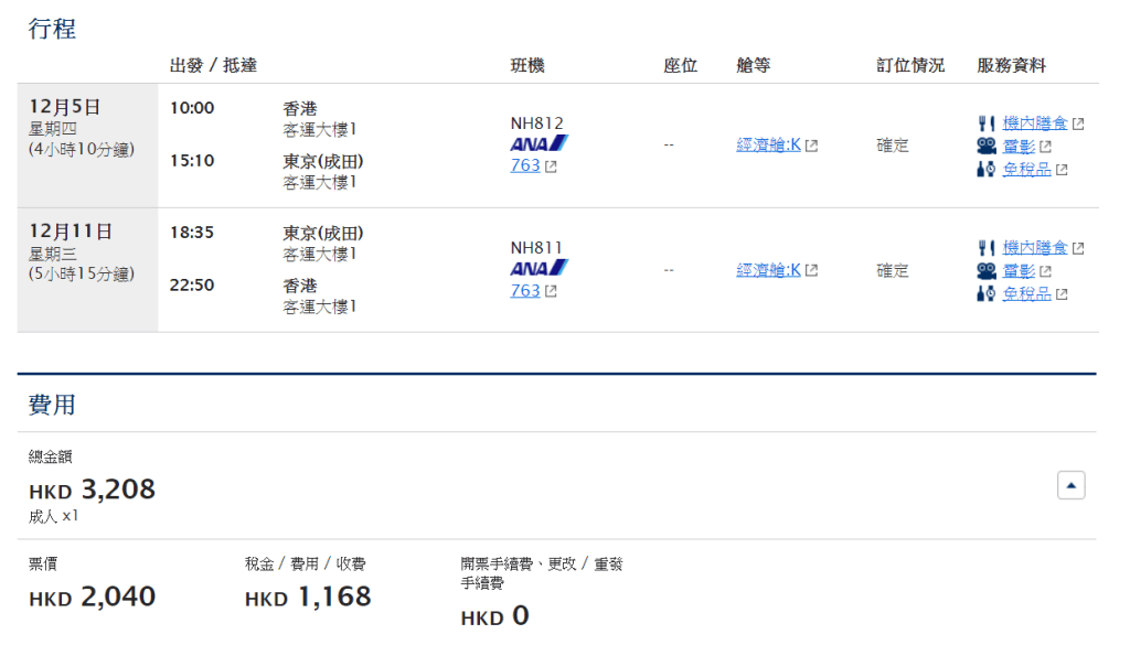 以5/12-11/12為列,香港飛東京成田來回連稅$3,208