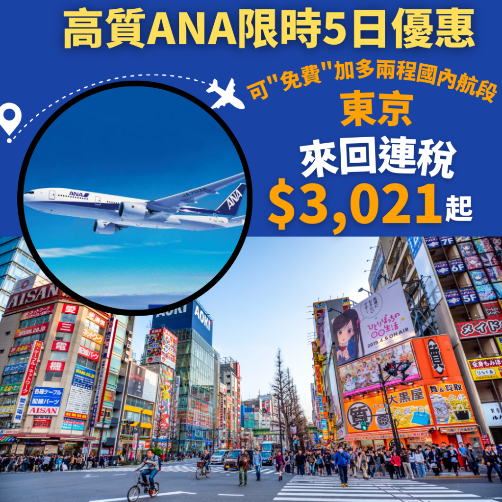 嘩!高質ANA限時5日優惠!連稅3千起!可”免費”加多兩程國內航段!香港飛東京成田/羽田來回連稅只需$3,021起、札幌$3,190起 – ANA全日空 (優惠至9月24日)