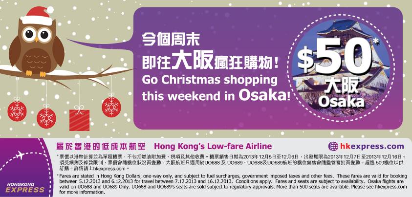 勁抵!快搶!再創新低!香港飛大阪來回只需$60 – 香港快運 (優惠至12月6日)