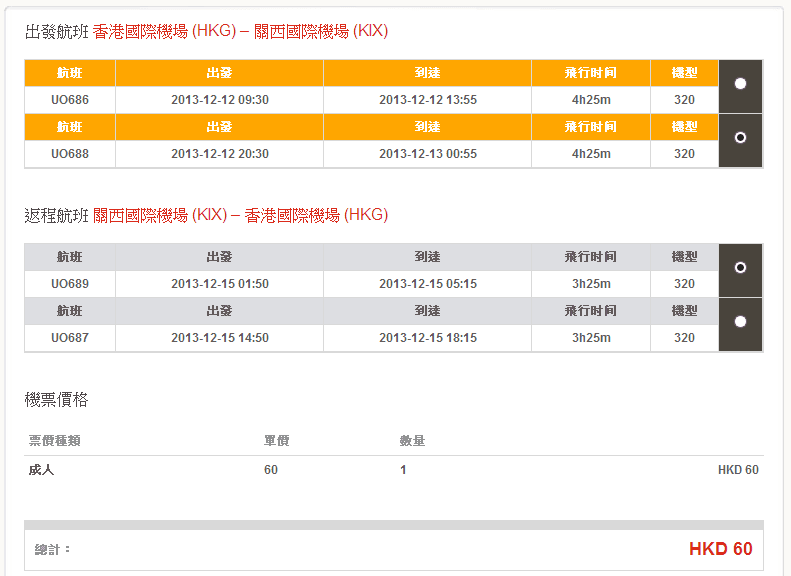 要留意得新增加既航班(去程:UO688/回程:UO689)先有咁平,晚機去凌晨機返