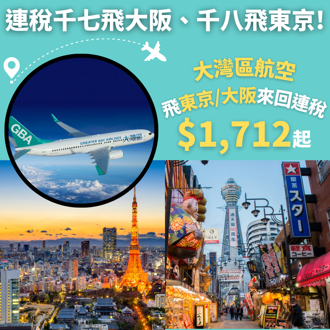 連稅千七飛大阪、千八飛東京!包20kg寄艙行李!明年3月28日前出發!香港飛大阪來回連稅只需$1,712起、東京$1,850起 – 大灣區航空 (優惠至10月1日)