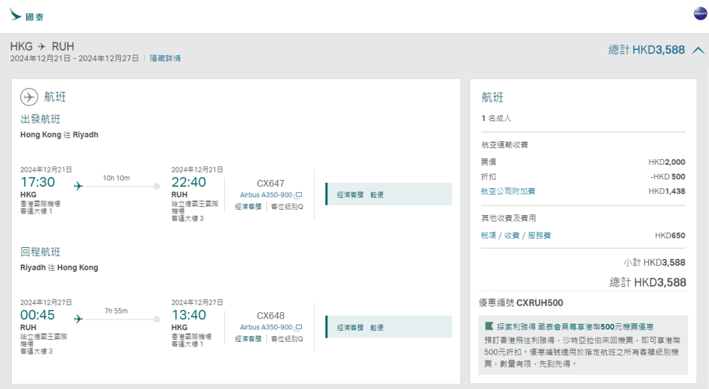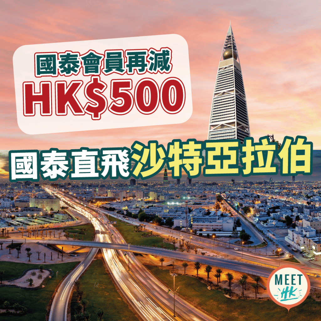 連稅三千五!直飛沙特亞拉伯首都利雅得!探訪神秘國度!香港直飛利雅得來回連稅只需$3,588起 – 國泰航空 (優惠至10月31日)