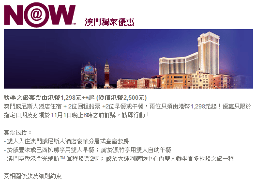 澳門威尼斯人推出左秋季之旅套票優惠,豪華套房 + 回程船票 +雙人早餐或自助午餐 只需港幣 1,298元起,除返每人每晚$650都唔駛