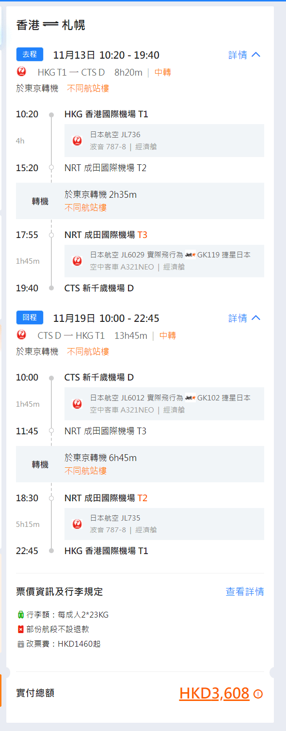 以13/11-19/11為列,香港飛北海道札幌(經東京成田轉機)來回連稅$3,608 (銀聯信用卡或銀聯二維碼減$160)
