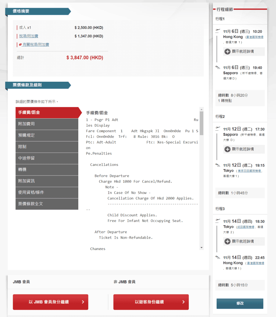 以6/11香港飛札幌(經東京成田),12/11札幌飛東京羽田,14/11東京成田飛香港,來回連稅$3,847