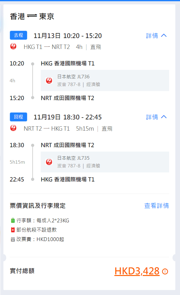 以13/11-19/11為列,香港飛東京成田來回連稅$3,428 (銀聯信用卡或銀聯二維碼減$160)