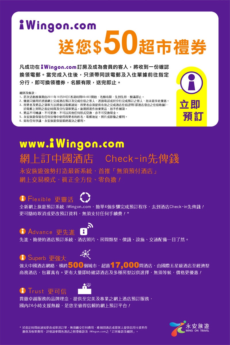 iWingon.com 係永安旅遊旗下既酒店訂購網站,永安旅遊係2010年俾國內最大網上旅行社攜程旅行網 Ctrip.com 收購左,因此 iWingon.com 入面既酒店基本上係同攜程一樣,大家可當 iWingon.com 係攜程既香港分站,主打國內酒店,而家佢地做緊 promotion,只要成功係 iWingon.com 訂酒店同成為會員,就有$50超市禮券送。大家要留意一下條款