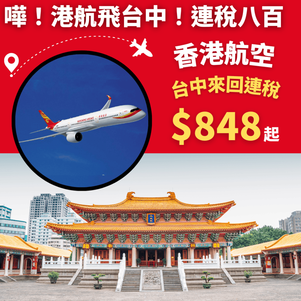 嘩!港航飛台中!連稅八百咋!12月16日前出發!香港飛台中來回連稅只需$848起 – 香港航空 (優惠至10月23日)