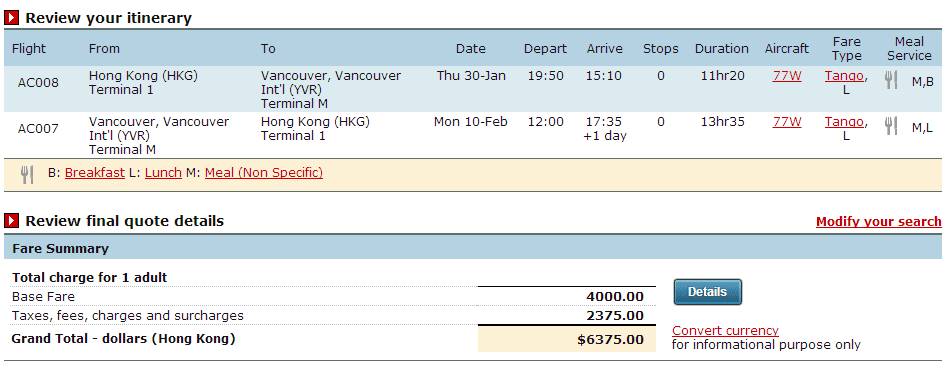 機票只需$4,000 + $2,375 (稅) = 機票連稅$6,375