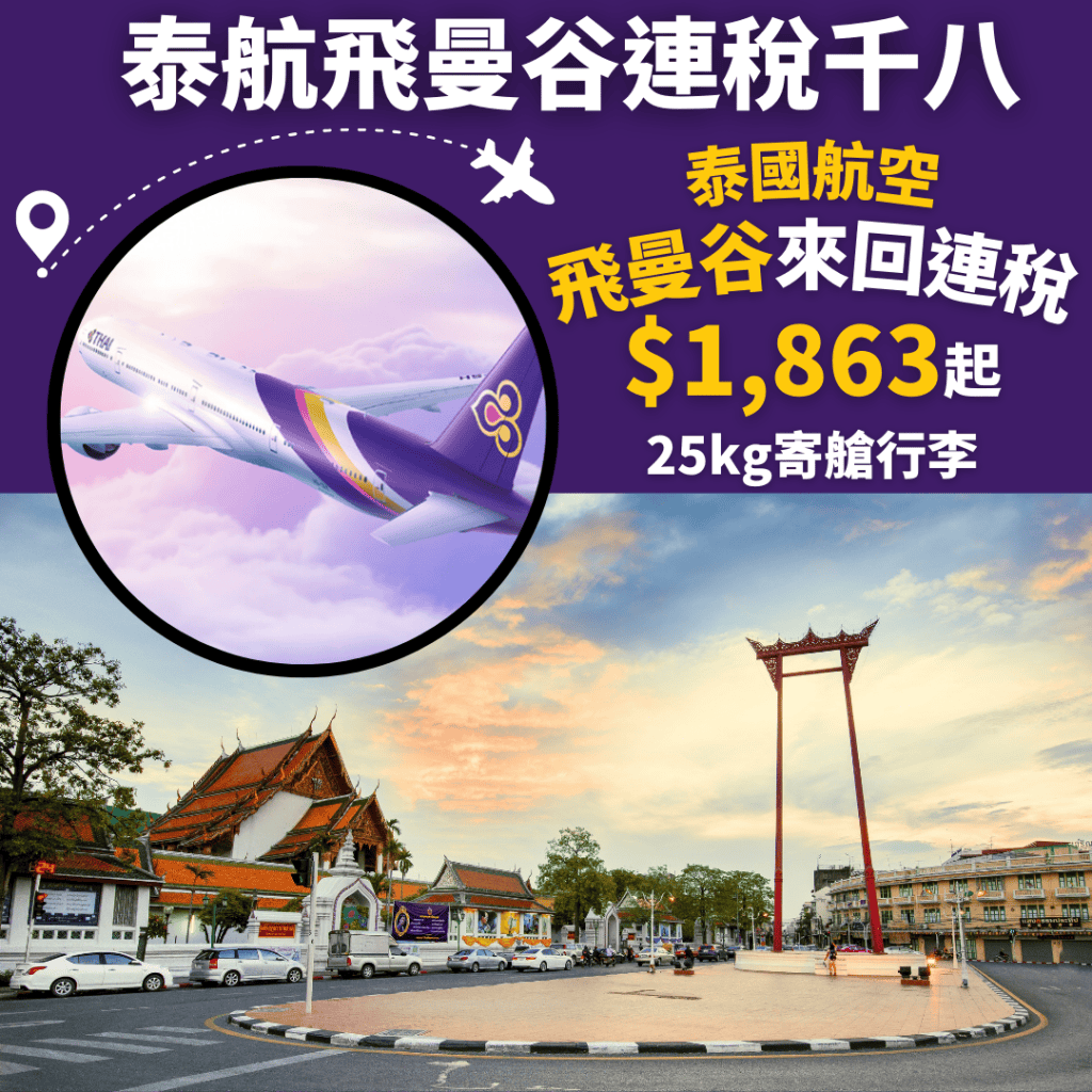 香港飛曼谷來回連稅只需$1,863起,包咗25kg行李