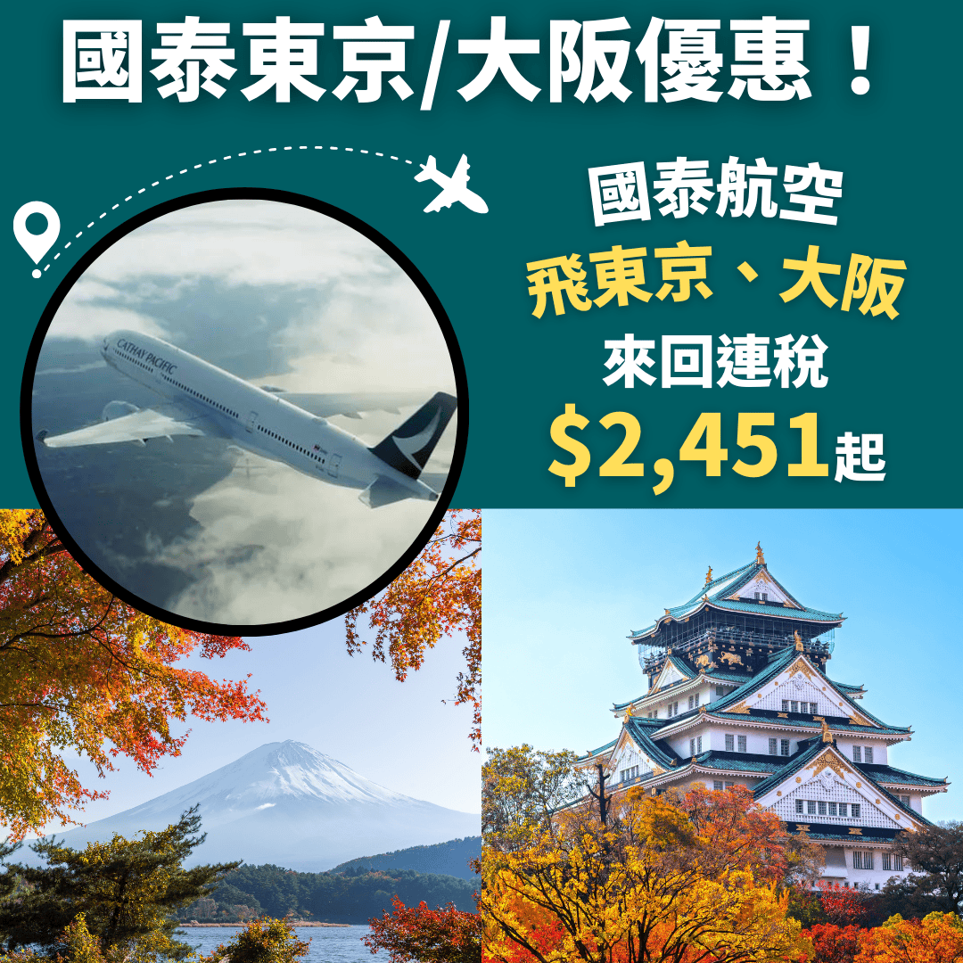 國泰飛東京/大阪!連稅2千4起!12月15日前出發!香港飛東京、大阪二人同行來回連稅每人$2,446起 – 國泰航空 (優惠至10月31日)