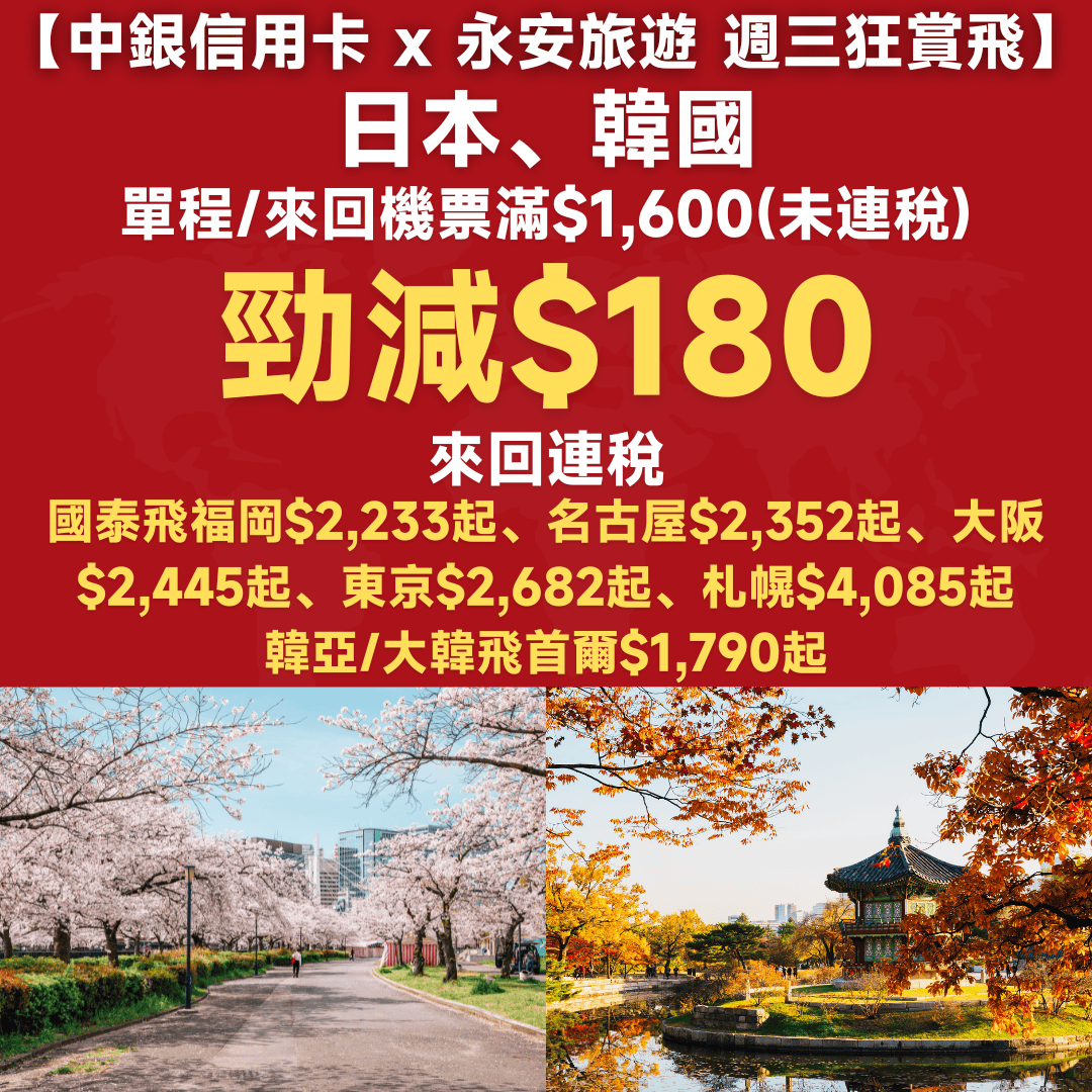 【中銀信用卡 x 永安旅遊 週三狂賞飛】玩轉日韓!日本、韓國機票滿$1,600(未連稅)勁減$180!來回連稅:國泰飛福岡$2,233起、名古屋$2,352起、大阪$2,445起、東京$2,682起、札幌$4,085起;韓亞/大韓飛首爾$1,790起