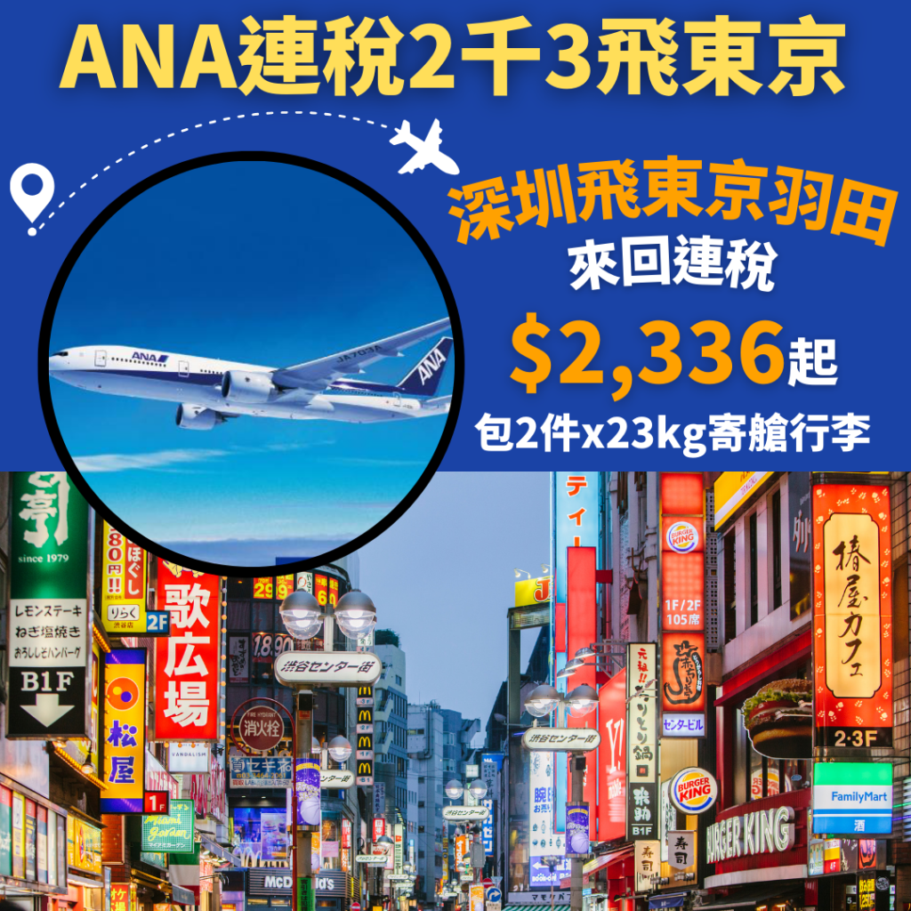 ANA連稅2千3飛東京!包2件各23kg寄艙行李!明年6月30日前出發!深圳飛東京羽田來回連稅只需HK$2,336起 – ANA全日空 (優惠至11月13日)
