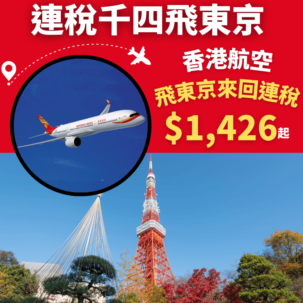 連稅千四飛東京!明年1月16日前出發!香港飛東京來回連稅只需$1,426起 – 香港航空 (優惠至11月22日)