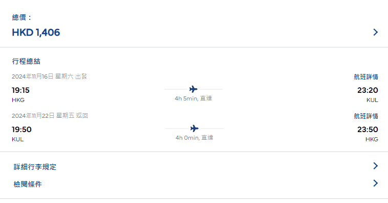 香港飛吉隆坡來回連稅只需$1,410起,包10kg寄艙行李!